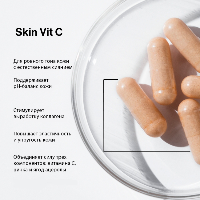 Skin Vit С объединяет силу трёх компонентов: витамина С, цинка и ягод ацеролы. Формула комплекса нутриентов Skin Vit С разработана таким образом, что все компоненты работают синергично и усиливают действия друг друга. Skin Vit С идеален для тех, кто хочет добиться ровного тона кожи с естественным сиянием.