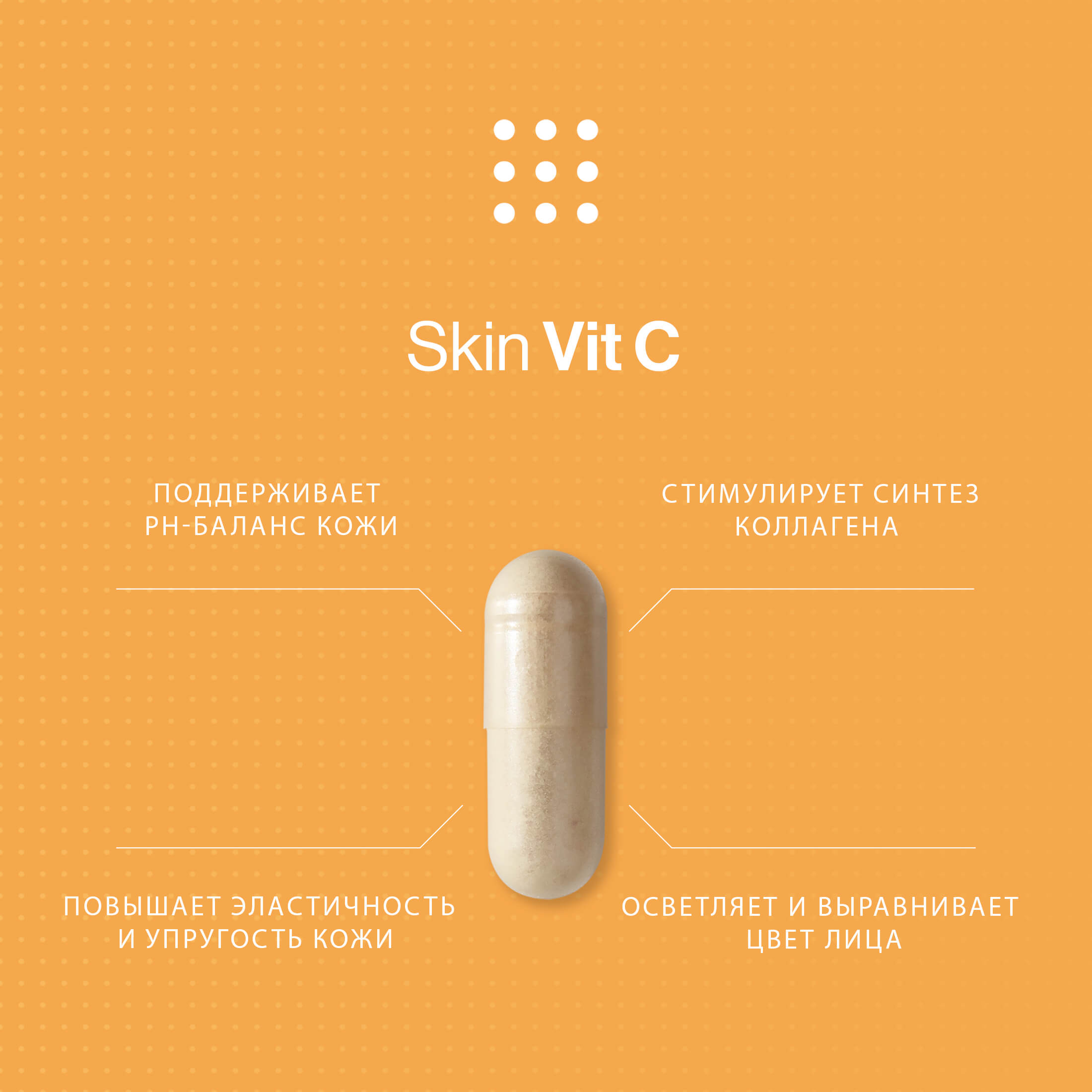 Skin Vit С — мультиформула Витамина С для ровного тона и сияния кожи, объединяет силу трех компонентов: витамина С, цинка и ягод ацеролы. Формула комплекса нутриентов Skin Vit С разработана таким образом, что все компоненты работают синергично и усиливают действия друг друга. Skin Vit С идеален для тех, кто хочет добиться ровного тона кожи с естественным сиянием.